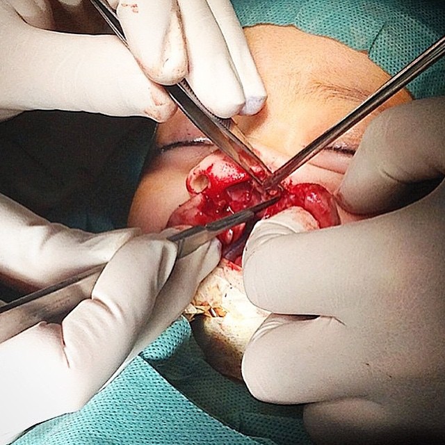 In the photo, the surgeon tries to realign the bone fracture into its normal position, known as "open reduction". Later on, internal fixation will take place, and will involve a device or an implant that is placed on the bone in order to hold the broken bone together. This is done with screws, plates, rods or pins.